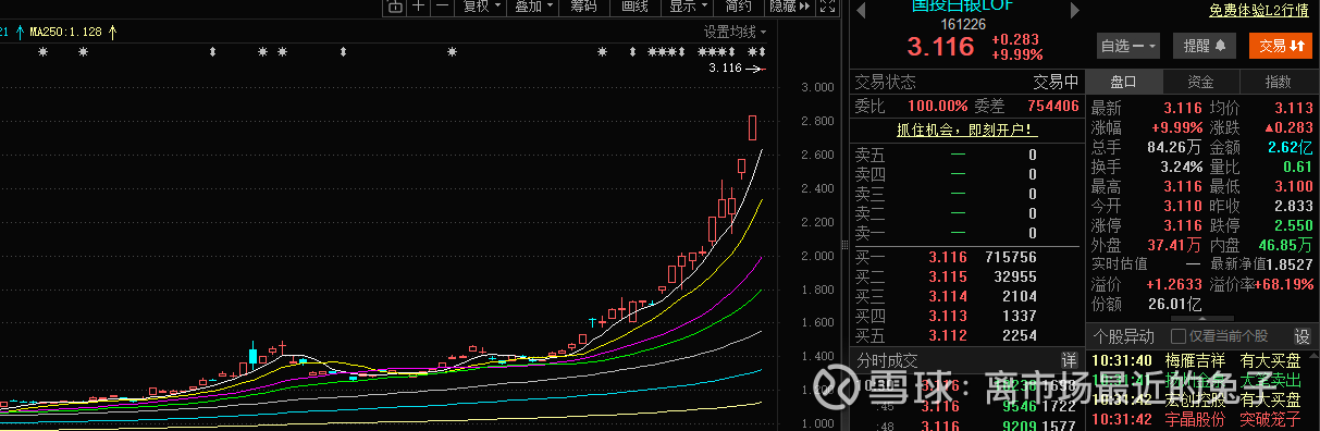 国投白银LOF:白银期货带动下,股价连续两日涨停,创出历史新高,目前溢价率高达55%,周一场内申购,现在卖出的套利者赢麻了,与此相似的还有黄金LOF(两者都限购,现在风险较大)