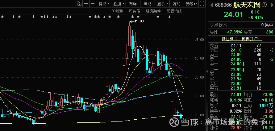 由于航天宏图发布了被实施退市风险警示公告,股价出现较大回撤,虽然在航天板块的带动下,周二一度翻红,但由于风控关系,机构不能大规模持有,还需要时间来盘整。