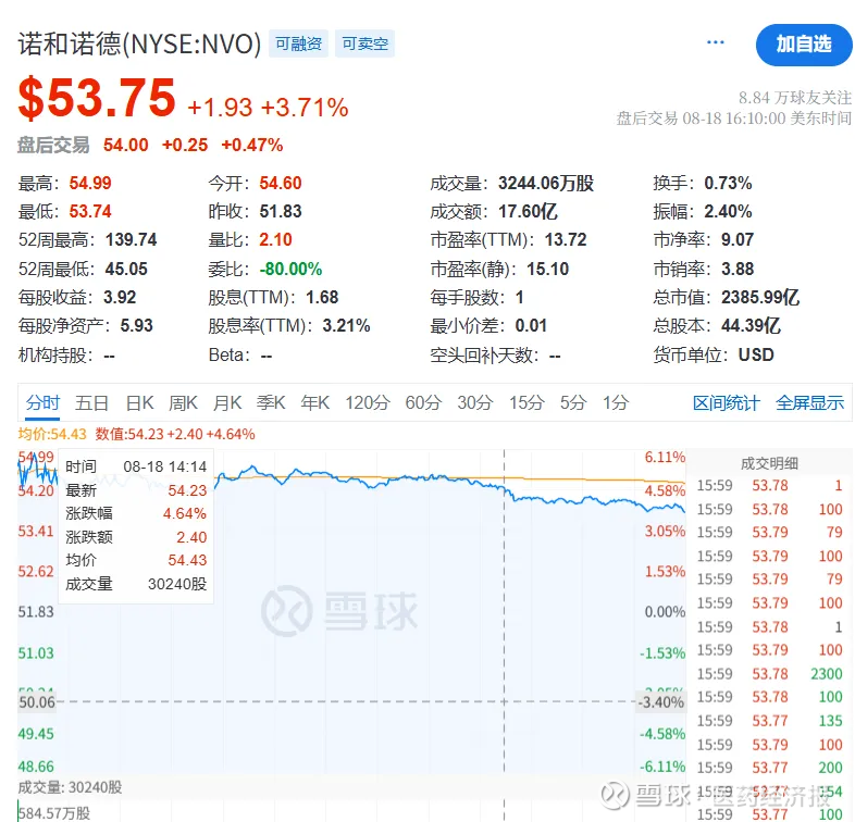 且在前一日,司美格鲁肽获得FDA批准,可用于治疗伴有中度至晚期肝纤维化(符合F2至F3期纤维化)的非肝硬化性代谢功能障碍相关脂肪性肝炎(MASH)后,诺和诺德股价已开始上涨。