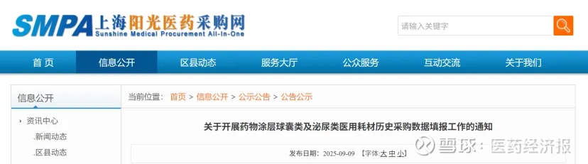 9月9日,上海阳光医药采购网发布《关于开展药物涂层球囊类及泌尿类医用耗材历史采购数据填报工作的通知》,根据国家医保局等八部门《关于开展国家组织高值医用耗材集中带量采购和使用的指导意见》(医保发〔2021〕31号)精神,为摸清药物涂层球囊类及泌尿类医用耗材临床实际使用情况,现组织医疗机构开展药物涂层球囊类及泌尿类医用耗材历史采购数据填报工作。