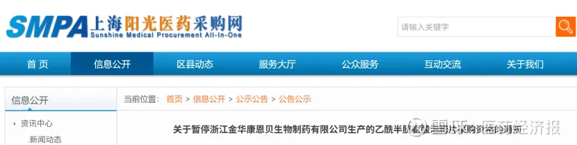 9月8日,上海阳光医药采购网显示,暂停康恩贝的乙酰半胱氨酸泡腾片采购资格,规格为0.6g*14片一盒,原因是生产不符合规定。