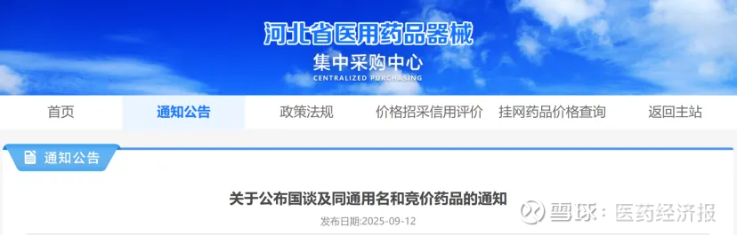 河北省医用药品器械集中采购中心发布《关于公示国谈及同通用名和竞价药品的通知》(下称《通知》),受理时间:2025年9月8日至10日。