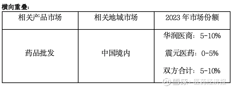 据悉,在相关产品市场的国内药品批发领域,华润医商在2023年的市场份额为5%~10%,而震元医药市场份额为0~5%,双方合计份额为5%~10%。