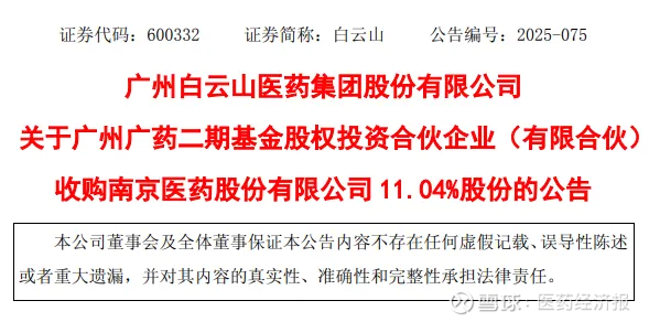 9月28日,白云山发布公告称,公司附属企业广州广药二期基金拟出资7.49亿元收购南京医药1.45亿股非限售股份,占南京医药总股份数的11.04%。