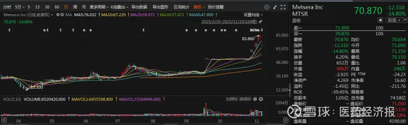 在经过综合评估后,诺和诺德最终认为,在此价格基础上继续加价不符合其财务纪律与战略效益最大化的原则,选择了主动退出。Metsera 股价随后暴跌,截至11月11日收盘,Metsera股价为70.87美元/股,总市值降至74.58亿美元。