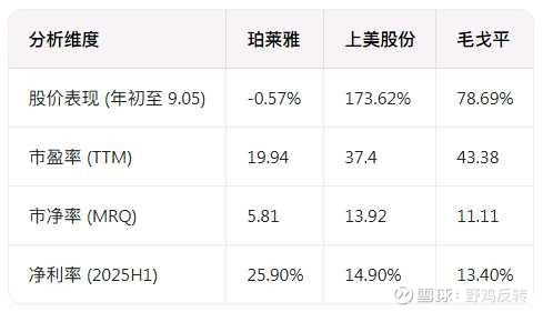 毛戈平:高端优势明显但后知后觉毛戈平在高端美妆市场也很优秀,品牌溢价能力强,上半年净利率都快26%了,增速也比珀莱雅高。同样错过了低成本布局机会。