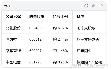 公司名称股票代码持股比例备注兆驰股份002429约 6.32%前十大股东老凤祥600612约 2.44%珠宝零售龙头歌华有线600037约 1.46%广电同业中国电信601728约 0.25%持股约 1.1 亿股