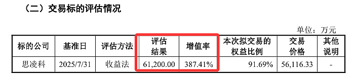 更值得注意的是交易估值。思凌科截至2025年7月末的账面净资产约为1.26亿元,而此次交易中其全部股权估值被定为6.12亿元,溢价幅度高达387.41%。