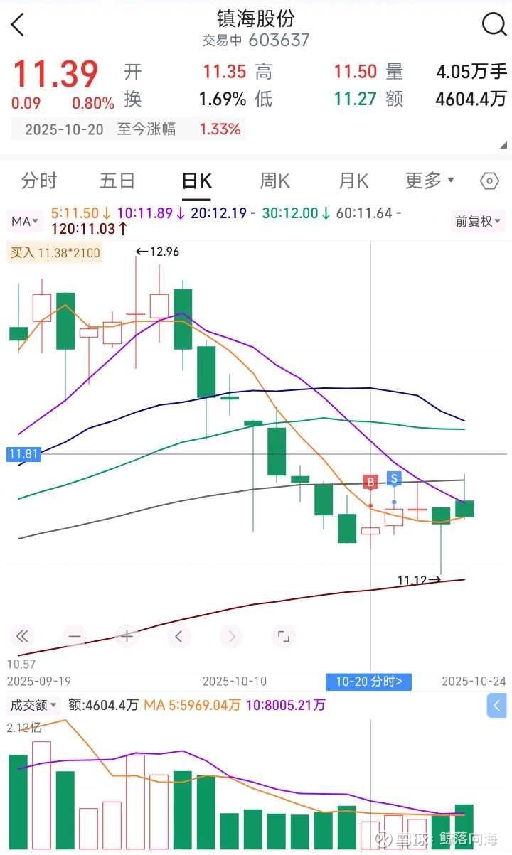 2025年10月19日复盘发现这个票的,20号建仓买了一点点,在11.38买了一点点,没买到当天最低点(11.27),如果能买在11.30我应该可以拿的更稳。