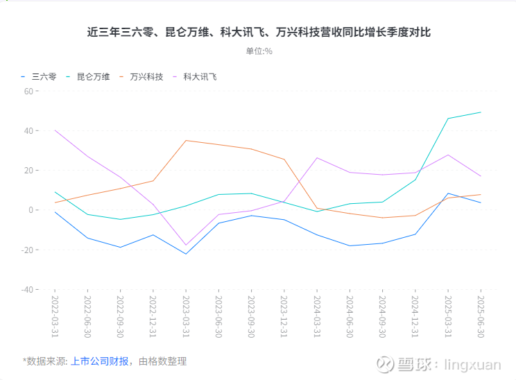 我们不能因为360并没有明显的营收增长就说它不是搞AI应用的,作为一个AI创业者,我只能说在国内搞AI变现真的非常困难,豆包不收费,元宝不收费,凭什么360的搜索要收费?那可以放点广告么?暂时也不能,因为豆包和元宝暂时没想着放。要靠AI应用赚钱,得出海。昆仑万维就很聪明,早早出海了,基本只搞海外的AI应用,所以它的营收有增长不奇怪。万兴的营收体量太小,基本都是工具类产品,在海外竞争也挺大的,不咋赚钱也不奇怪。讯飞比较特殊,它的业务构成非常复杂,不是靠技术投入就一定能拉高增长的。有一说一,就上面得营收增速图来看,可能就只有昆仑万维的营收和AI应用相关性比较高。不过这个结论非常不严谨,仅供参考。