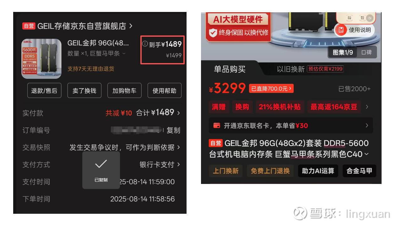先给大家讲个“鬼故事”,我今年8月14日在京东买了两条96G DDR5内存套装,实付价格1489元,而今天从京东看同款产品的价格是 3299元,短短几个月,涨幅121%