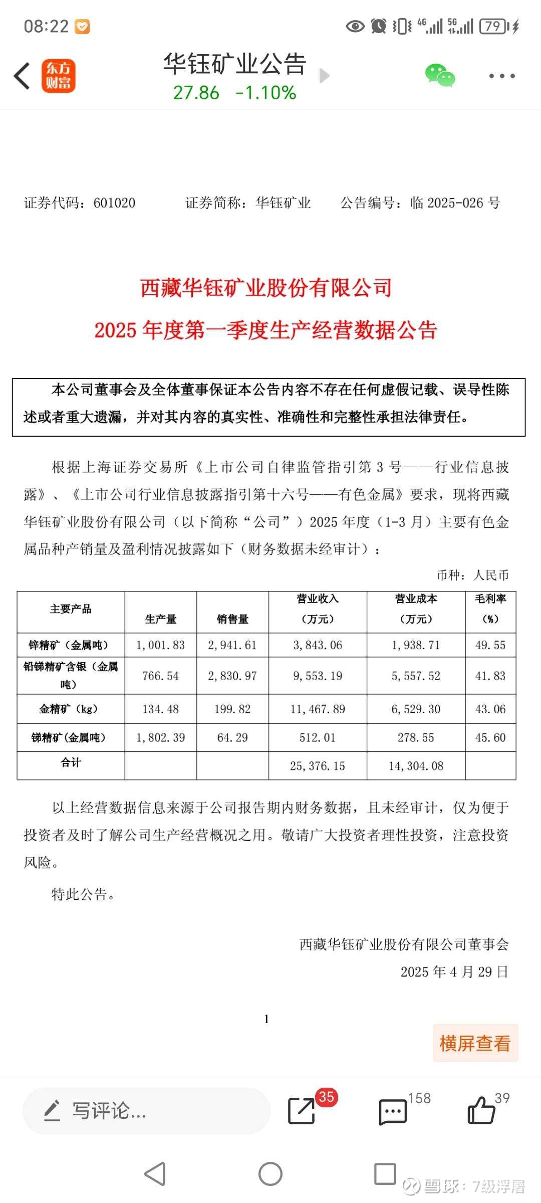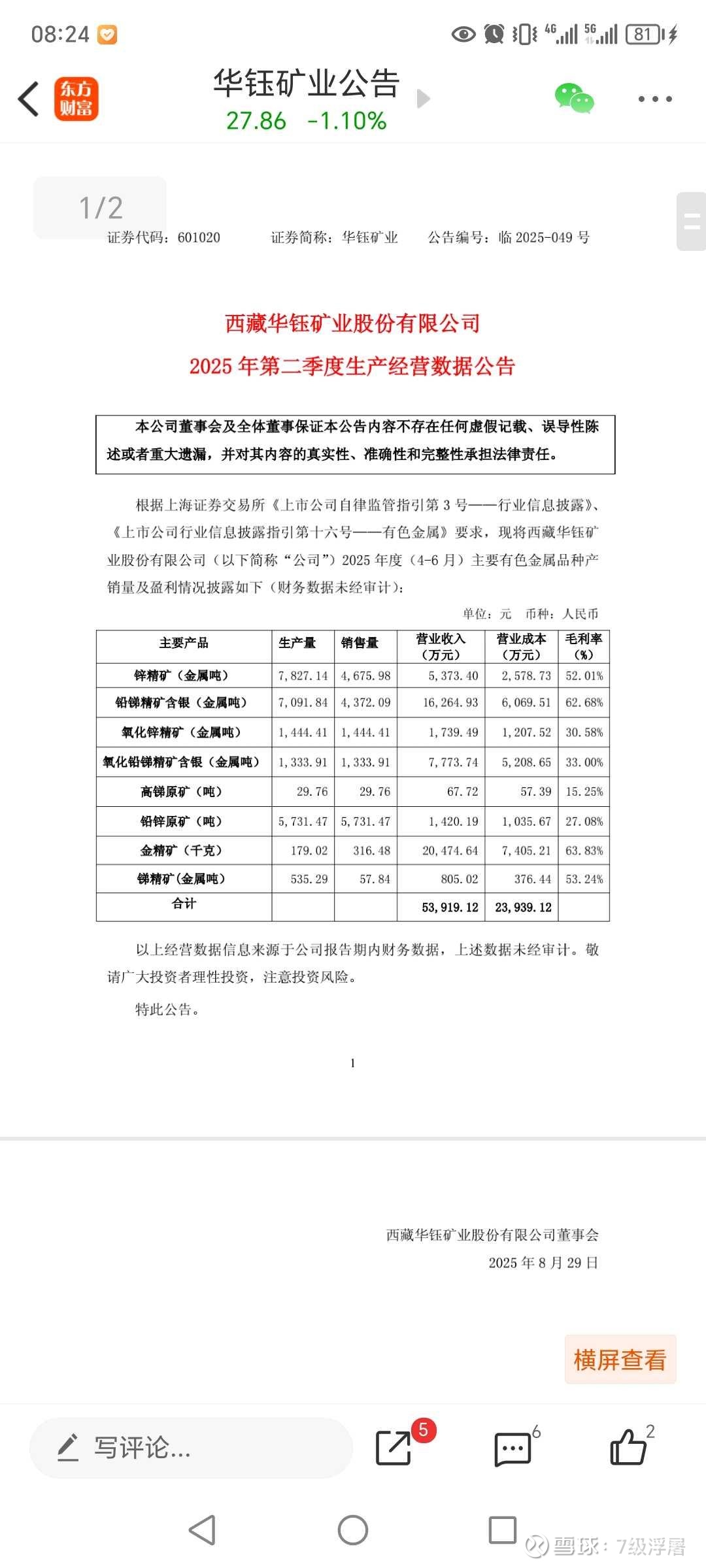 根据公开信息,华钰矿业2025年上半年自产锑7712吨 。另外,塔铝金业2025年计划生产锑精矿0.8万吨(权益产能),华钰矿业拥有其50%的权益,即上半年塔铝金业为华钰矿业贡献的锑精矿权益产量约为0.4万吨。根据公司公开的生产信息显示,一季度生产锑矿1802吨,二季度仅生产535吨,合计2337吨,而销售仅121吨,藏了2200吨,而且生产力没有开足。再看铅锑精矿和金精矿,作为主力,毛利增长20个点。三季度仍有非常恐怖的看头。