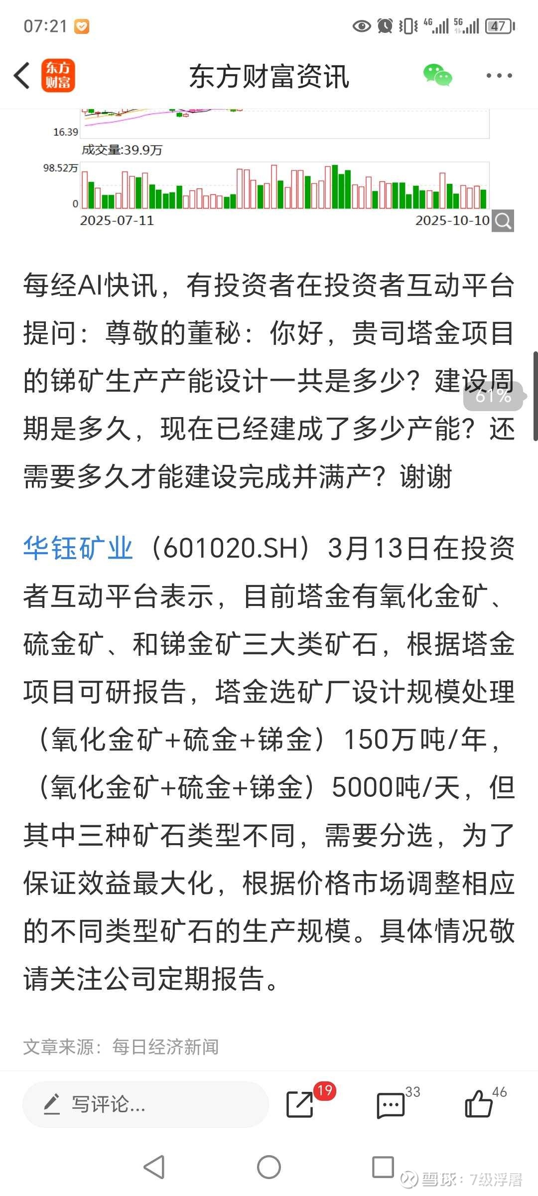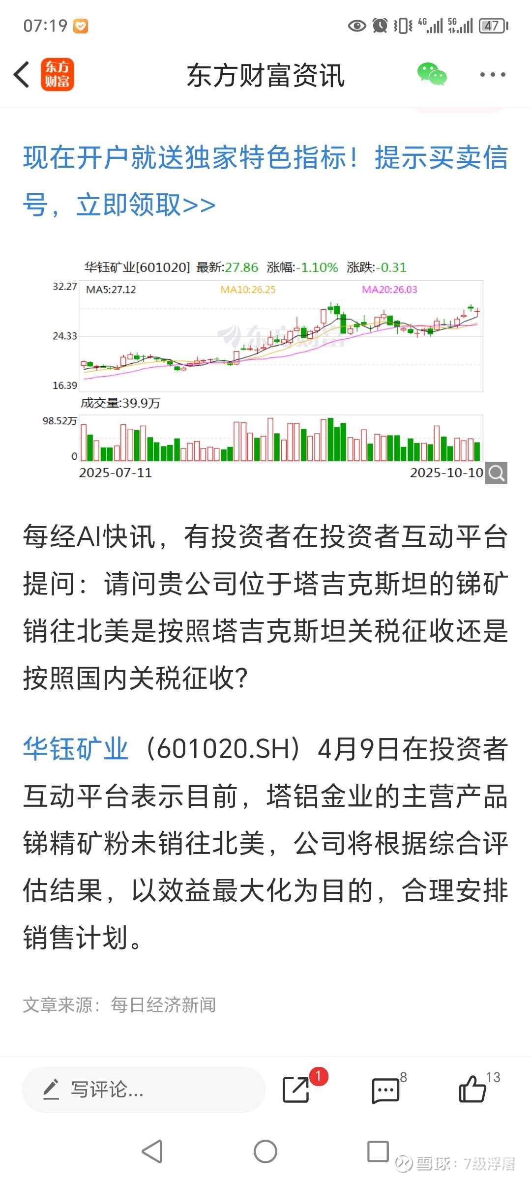 昨天正值特朗普要加关税,作为重要稀土资源,三季度业绩暴涨的公司,同时受益于锑价上涨和黄金上涨的公司,又有固态电池概念,多重利好下,华钰矿业目前的股价正好在16和17年的历史高位盘整,且已经洗盘调整1个半月,是否能借此机会,突破历史新高。让我们拭目以待。$华钰矿业(SH601020)$ $东芯股份(SH688110)$ $上海电力(SH600021)$ @小秘书