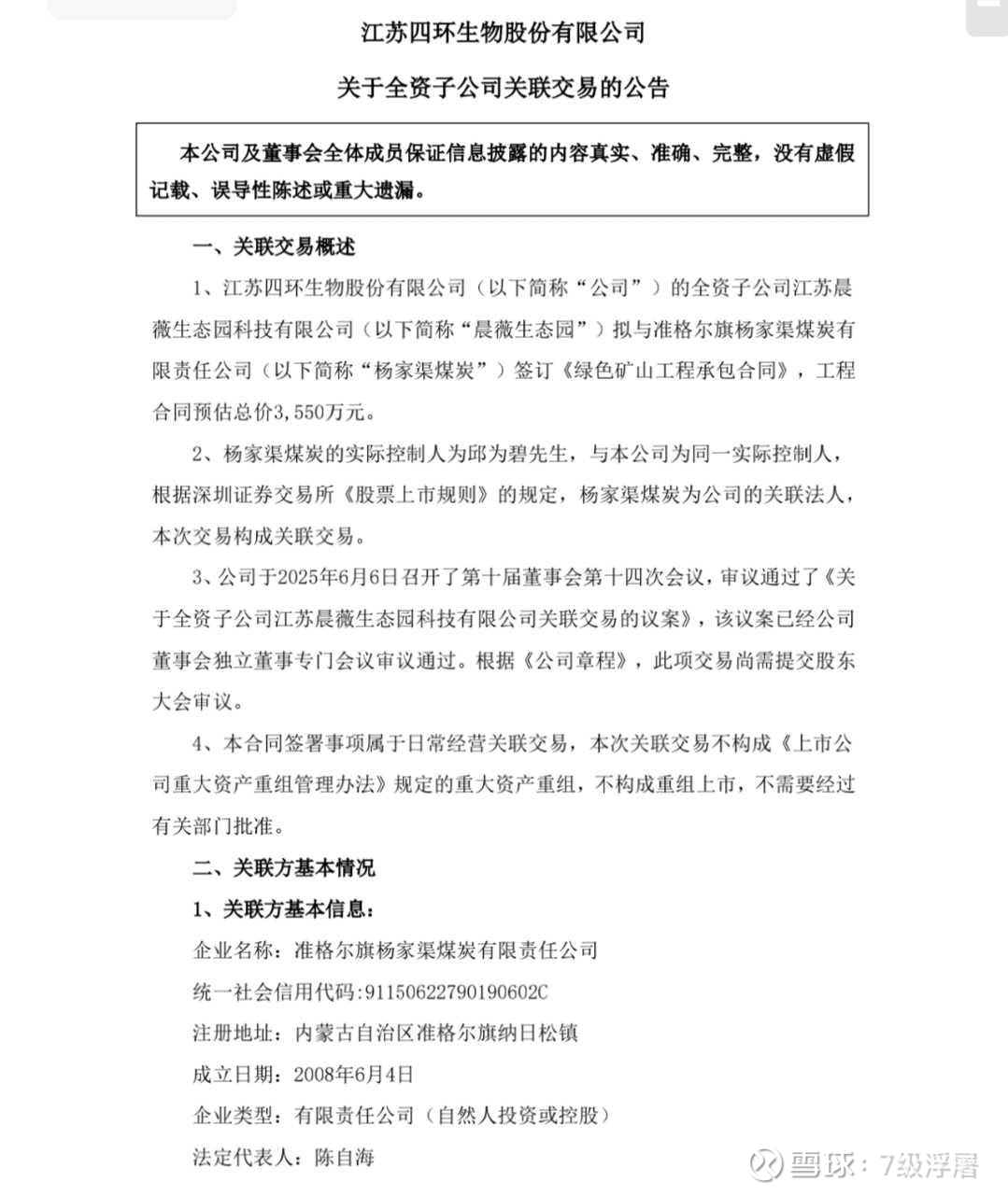- 准格尔旗杨家渠煤炭有限责任公司:公司属于四环生物旗下企业,邱为碧通过内蒙古隆泰丰投资管理有限公司间接关联该公司,公司经营范围包括煤炭开采、洗选、加工、销售等。