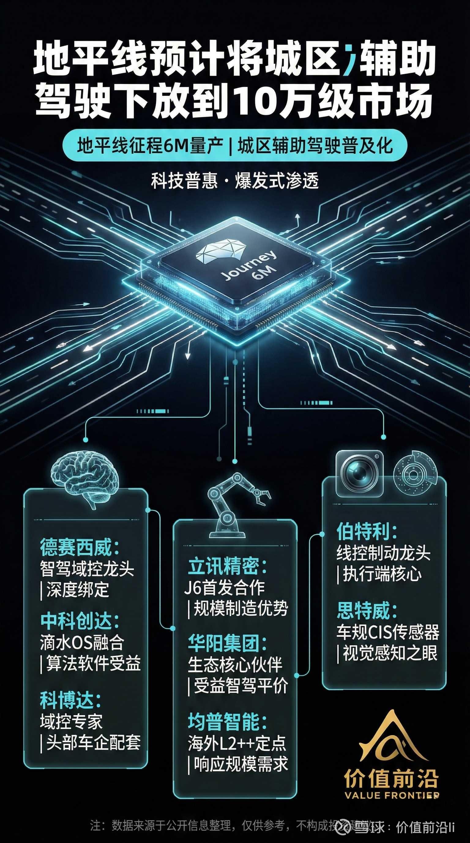 随着地平线(Horizon Robotics)宣布将其最新的征程6M(Journey 6M)芯片量产,并明确提出将“城区辅助驾驶下放到10万级市场”的战略目标,中国智能驾驶行业正式迎来了一个分水岭时刻。这不仅仅是一次产品的迭代,更是一场关于“科技普惠”的供应链重塑。本文将深度剖析地平线J6M量产背后的产业逻辑,详解围绕其建立的“智驾生态圈”,并挖掘其中蕴含的巨大产业链投资机会。