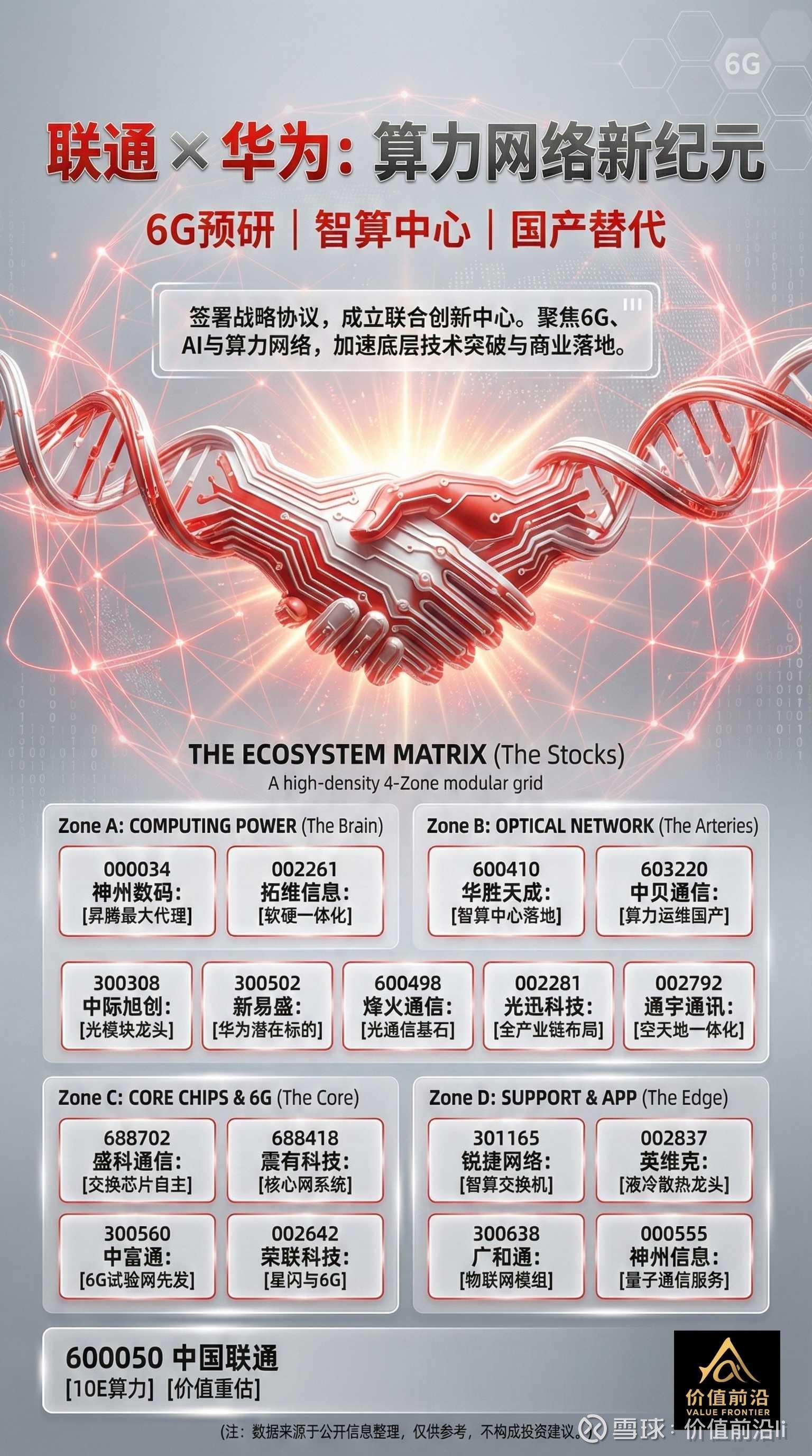 本次合作的核心逻辑在于**“要素重组”**:联通拥有覆盖全国的传输网络和数据中心资源(管道与机房),而华为拥有从底层芯片(昇腾/鲲鹏)到上层应用(盘古大模型/5.5G)的全栈技术能力(大脑与神经)。两者的结合,将加速推动从“流量红利”向“算力红利”的切换,并在6G预研阶段抢占全球技术高地。