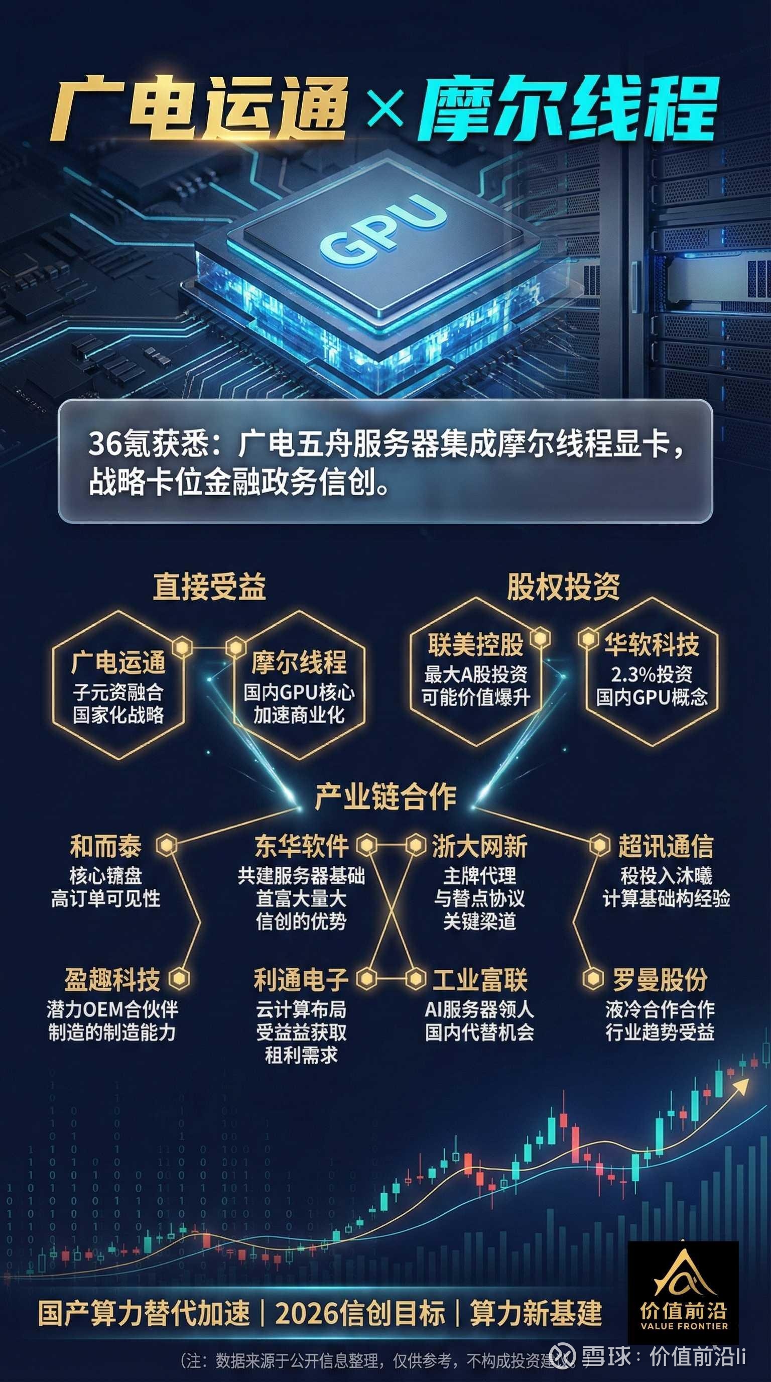 在“数字中国”建设与地缘政治博弈双重叠加的时代背景下,国产算力基础设施的自主可控已不再是单纯的商业选择,而是关乎国家金融与政务安全的战略必答题。近期,广电运通旗下广电五舟服务器宣布集成摩尔线程显卡,这一标志性事件如同在平静的湖面投下一颗深水炸弹,激起了国产GPU商业化落地的层层涟漪。本文将以双方合作为切入点,深度剖析这一战略联盟背后的产业逻辑,拆解从直接受益方到股权投资,再到供应链合作的完整生态图谱,为您呈现2026信创目标下的国产算力新格局。