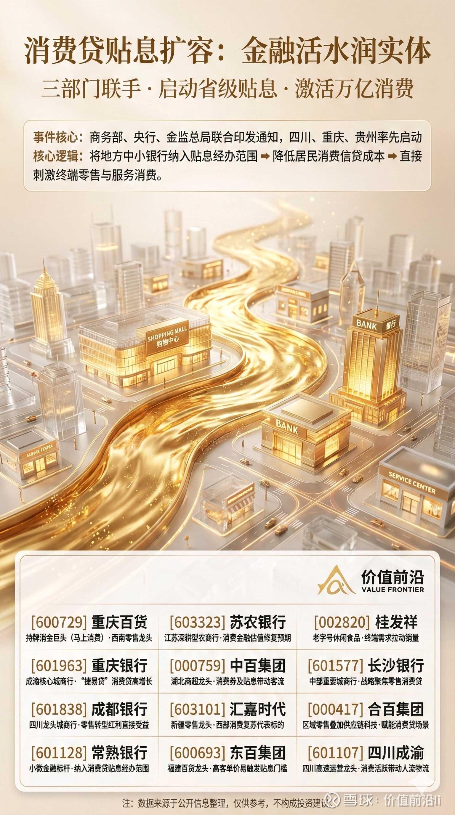 近日,商务部、央行、金监总局三部门联合印发通知,正式启动消费贷贴息扩容政策。这一政策犹如一道“金融活水”,旨在通过降低居民消费信贷成本,直接刺激终端零售与服务消费。本文将基于最新的政策动向(特别是四川、重庆、贵州的率先启动),结合一张涵盖核心受益股的“全景逻辑图”,深度剖析这一政策背后的经济逻辑、传导机制以及资本市场的潜在投资机会。