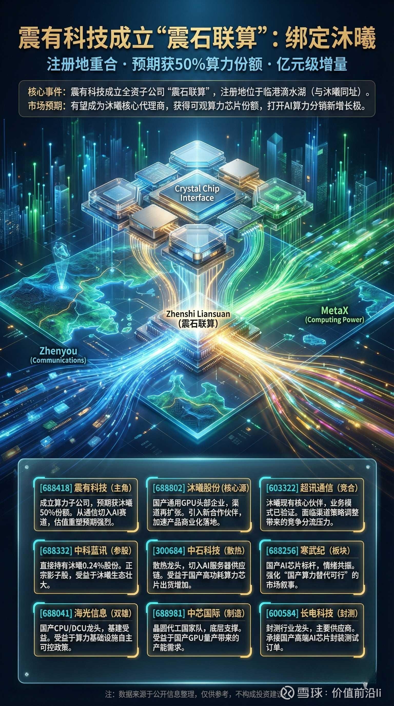 在国产替代加速与AI大模型军备竞赛的双重背景下,算力即国力。近日,震有科技(688418)成立全资子公司“震石联算”的消息在资本市场引发强烈关注。通过对公开信息的抽丝剥茧,我们发现这并非一次简单的工商注册,而是一场精心布局的战略卡位。注册地与国产GPU领军企业沐曦(MetaX)的高度重合,以及市场预期的“50%算力份额”,标志着震有科技正式从传统通信领域跨界切入AI核心算力赛道。本文将从事件核心逻辑、合作方价值、产业链影响及估值重塑四个维度,对这一重磅事件进行深度剖析。