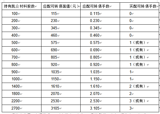 发行人原股东的优先认购通过上交所交易系统进行,配售简称为“凯众配债”,配售代码为“753037”。原股东优先配售不足1手的部分按照精确算法(参见释义)原则取整。