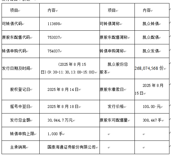 以下主要信息均从《上海凯众材料科技股份有限公司向不特定对象发行可转换公司债券发行公告》获取。