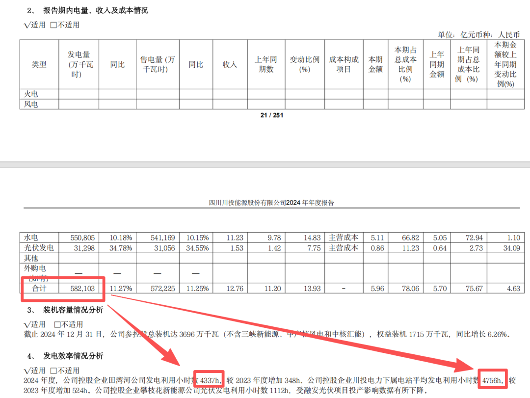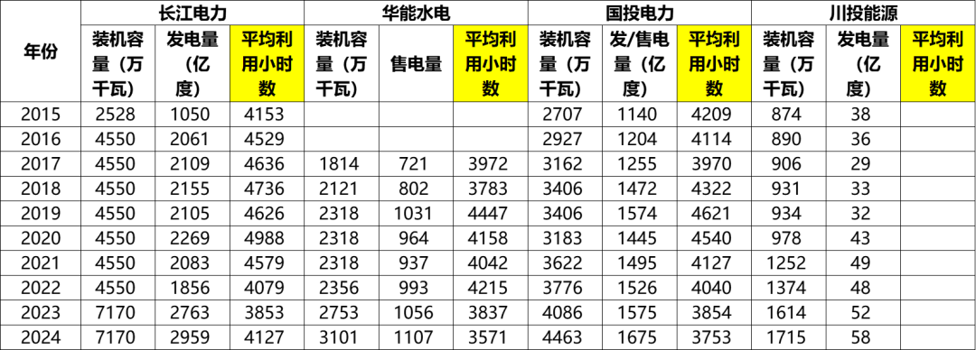 川投能源由于没有官方公布自己控股的装机容量,所以没有办法算出来,就留白了,根据其财报公布的数据,2024年大概在4300小时~4700小时左右。