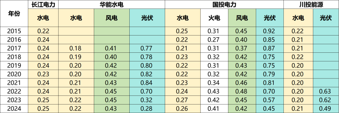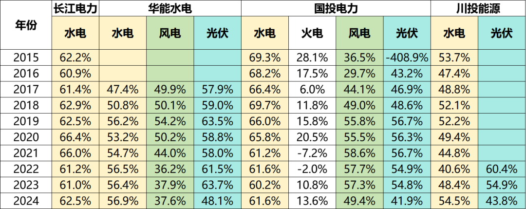 华能水电的光伏要高于他家的风电,最高达到60%+,但是2024年骤降至48.1%。
