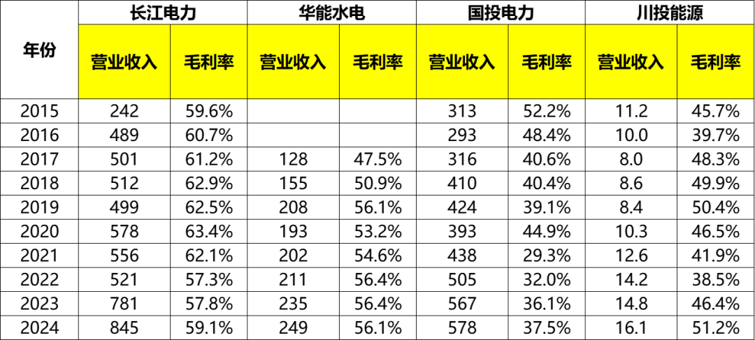 上篇文章中对比了长江电力、华能水电、国投电力、川投能源这四家公司的装机容量、发电量、平均利用小时数,各种电力类型的电价、毛利率以及度电成本等数据。