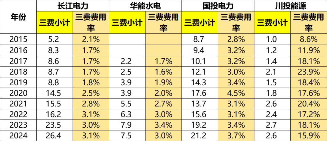 长江电力、华能水电两家的三费费用率都呈现上升趋势,从原来的1.X%上升到近三年的3%左右。