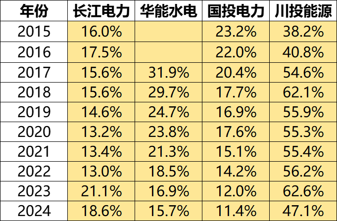 长江电力则排第三,2024年18.6%。可以预见在未来几年将开启新一轮的下降趋势。