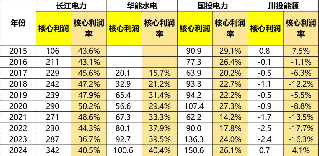 华能水电的核心利润率则让人眼前一亮,从2017年的15.7%一路波动增长,2024年已经突破40%。