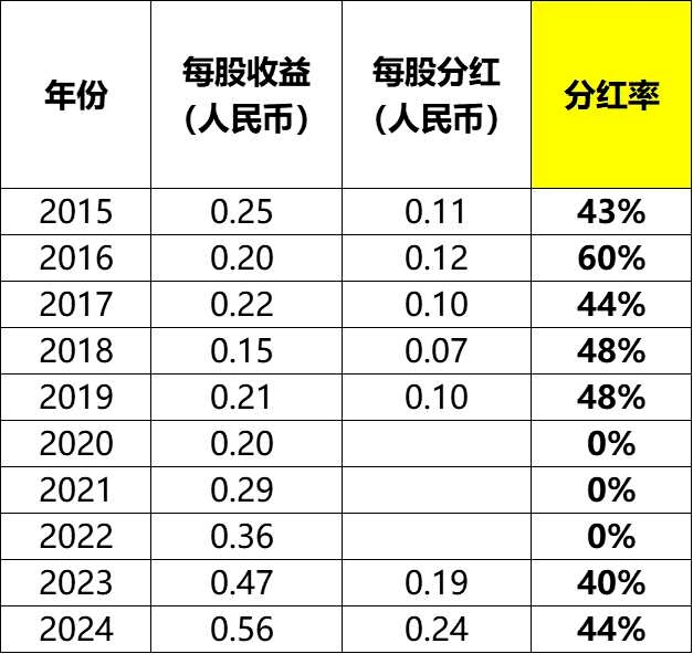 (2)分红率方面,2015~2024年间,2020~2022年停了3年,其他年份分红都在40%以上。