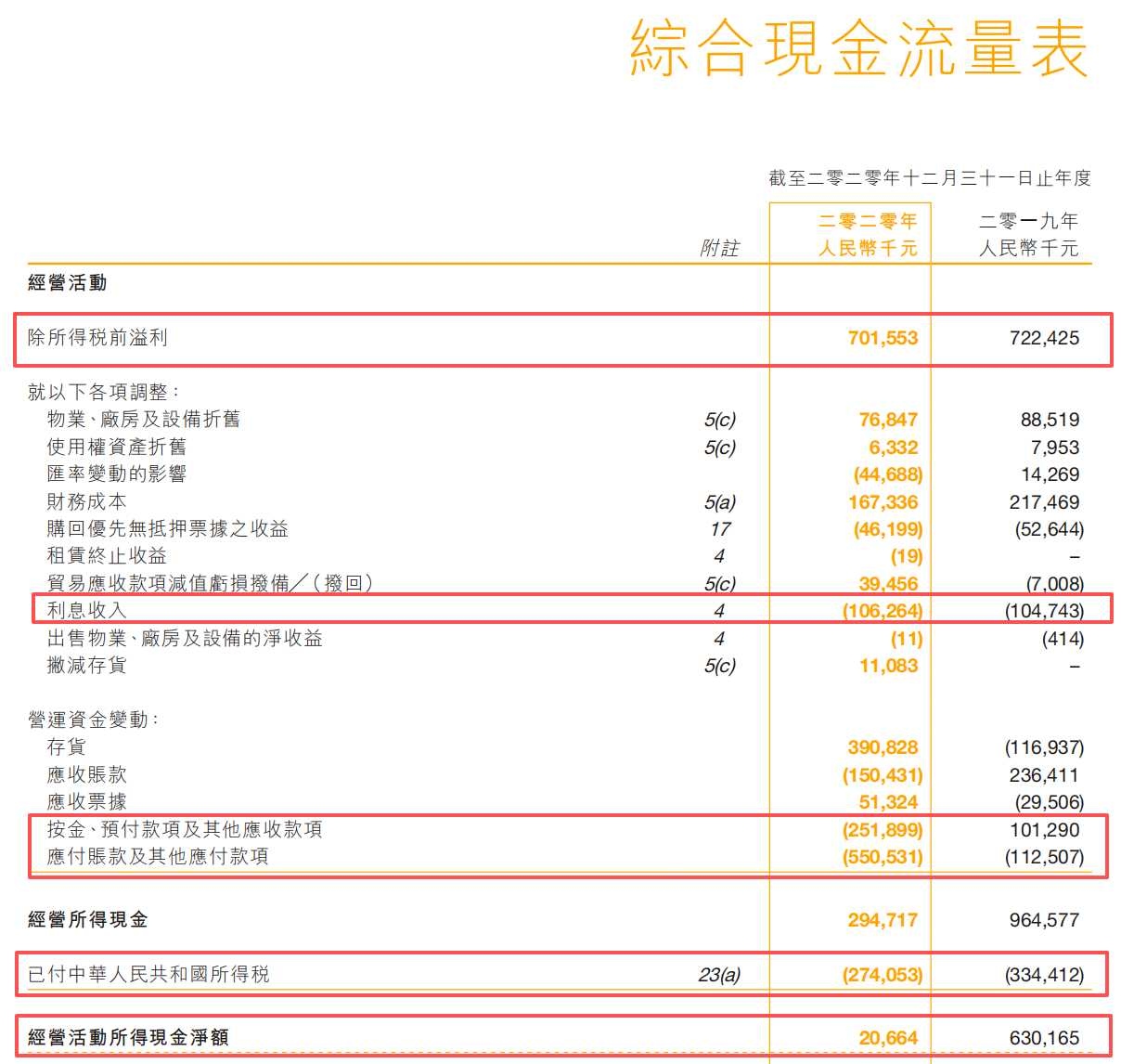 一是,预付给供应商的钱(按金、預付款項及其他應收款項)增加了2.51亿,导致现金流比税前利润减少2.51亿。而2010年是预付款减少了1亿,导致现金流比利润增加1亿。一来一去,在这里2020年现金流比2019年就少了3.5亿。