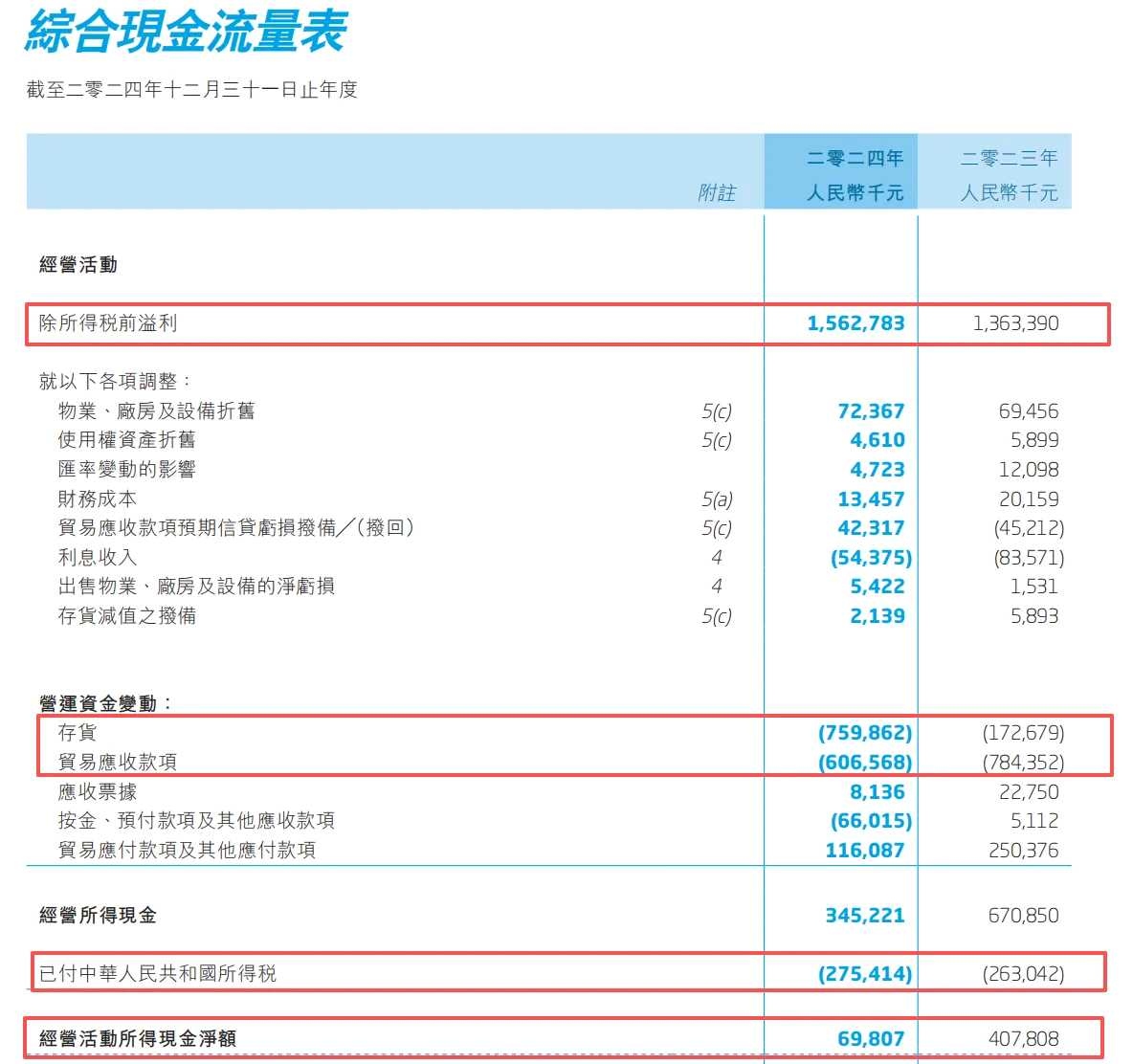 用相同的方法看2024年的现金流量表,可以发现,2024年存货增加了7.6亿导致现金流比税前利润少7.6亿。