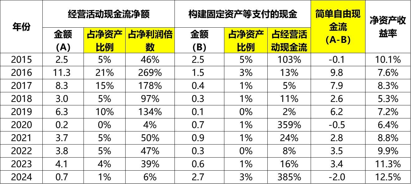 净资产收益率方面,2015~2024年最低为2018年的5.3%,最高为2024年的12.5%。从2020年的6.4%开始,逐年提升到了2024年的12.5%,还是不错的。