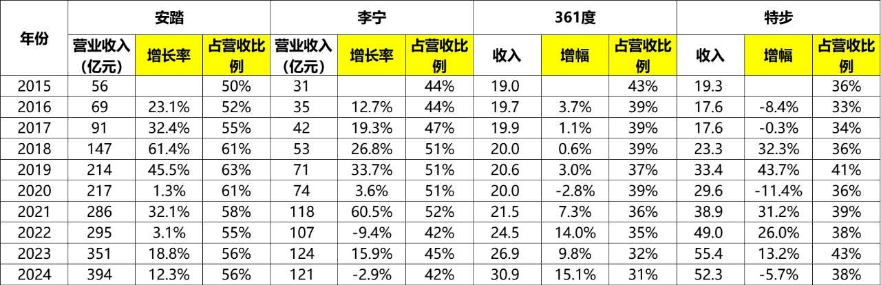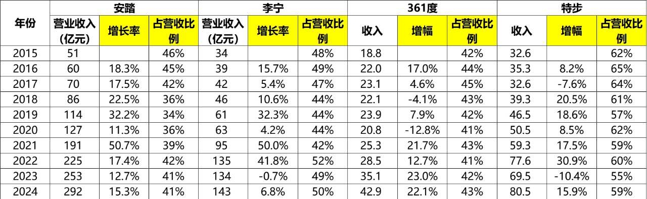 361度鞋类产品从2015年的18.8亿,增长到了2024年的42.9亿,累计增幅128%,年化增幅9.6%。其中2022~2024年同比增幅分别为12.7%、23%、22.1%,2023、2024两年增速强劲,占营收比例保持在40%左右。