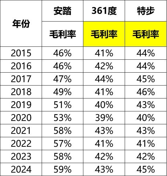 361度的营收增速则远远落后于安踏和李宁了,2024年营收约为2015年的2.2倍,远低于安踏和李宁的倍数,但是近三年的增幅表现强劲,都在20%左右的水平。毛利率方面则非常稳定,保持在40%多一点的水平。