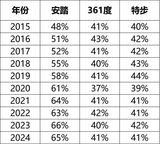 而361度、特步两家则较为稳定,基本维持在40%以上的水平。