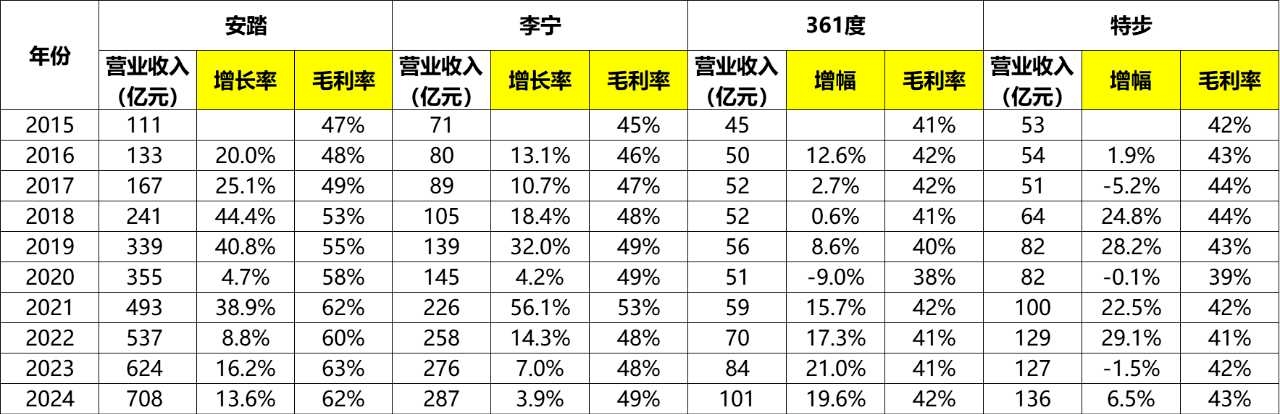 2024年,安踏的合并报表营业收入达到708亿,是李宁的2.5倍,是361度的7倍,是特步的5.2倍。