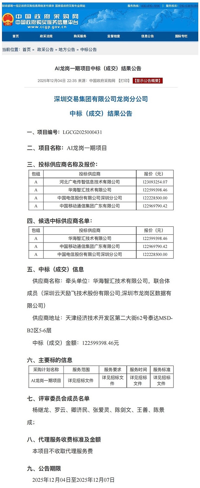 据政府采购网,亨通光电旗下公司华海智汇,于2025年12月4日,中标深圳市龙岗区AI一期项目,中标金额1.23亿,中标结果公示如下: