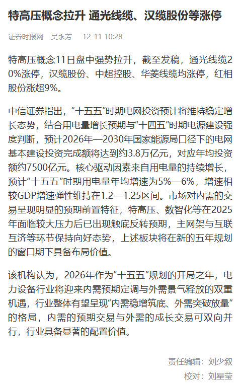 特高压概念11日盘中强势拉升,截至发稿,通光线缆20%涨停,汉缆股份、中超控股、华菱线缆均涨停,红相股份涨超9%。