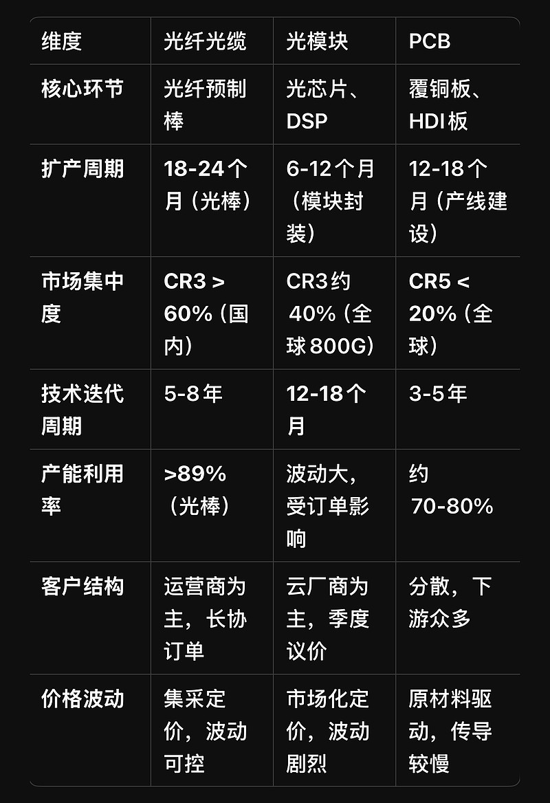 要论证光纤/光模块/PCB,哪个赛道的竞争格局最优,不能只看当下的市场热度,需要从进入壁垒、市场集中度、价格话语权、供需格局的稳定性四个维度进行系统性比较。