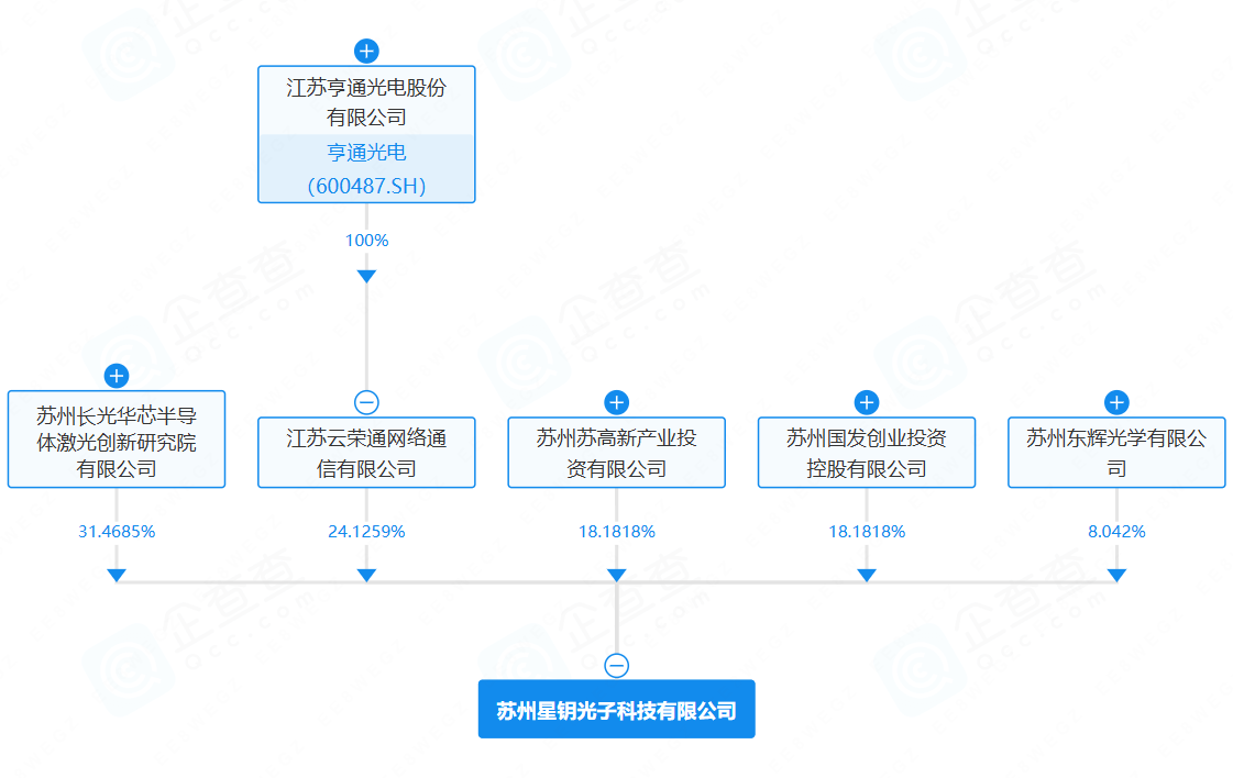 根据企查查和多家媒体报道,星钥光子由长光华芯、亨通光电、东辉光学共同发起。亨通光电通过旗下江苏云荣通网络通信有限公司持股。