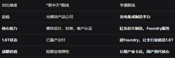 亨通没有盯着光模块产品,而是作为核心发起方之一(二股东),直接做“让全行业都能造1.6T光模块”的东西——硅光Foundry,解决的是国产硅光芯片制造“卡脖子”问题,这将对于亨通带来三大价值: