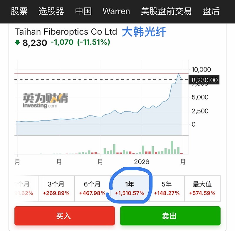 但是听说韩股涨的最多的不是存储,是一只光纤股,一看,我直接好家伙!大韩光纤,一年16倍(+1510%)!
