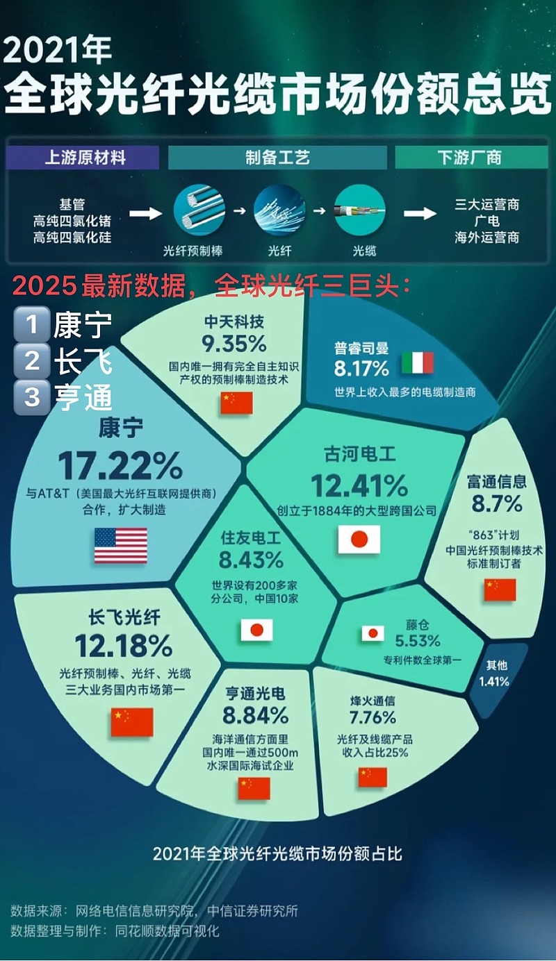 话说这大韩光纤,在全球光纤产业版图中根本就排不上号啊,2025年最新数据,全球光纤三巨头:1️⃣康宁(美国)、2️⃣长飞光纤、3️⃣亨通光电,再算上中天科技,三家中国企业占到全球近50%的光棒产能/市场份额!