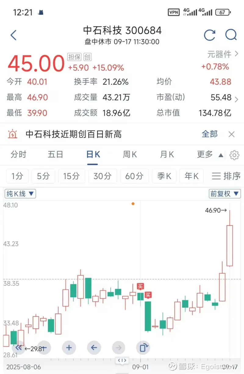 我以36元多的价格建仓中石科技,初始目标卖出价为45-50元。次日股价意外暴跌10%,但由于对该股基本面与逻辑有过深入研究,早有波动预期,因此并未慌乱,反而在尾盘选择加仓。