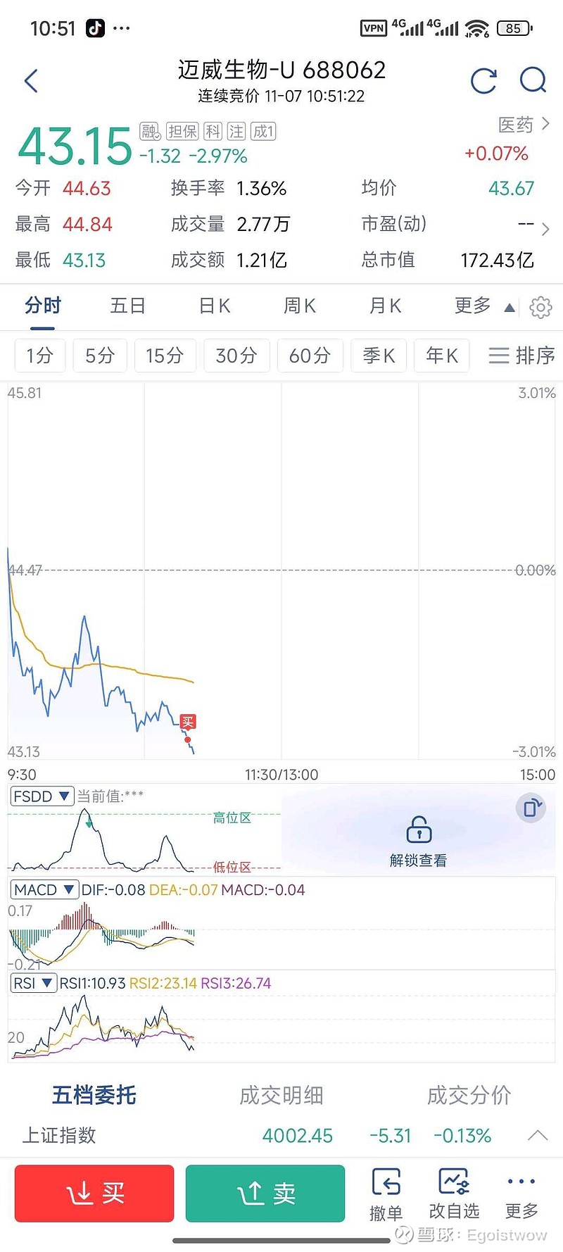 所以早上开盘看了几分钟盘挂了个43.2的买单,就去忙工作的事了。