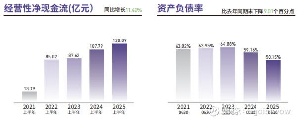 2) 财务健康度优化:资产负债率降至50.15%(同比下降9%,创近年来同期新低),经营性净现金流120.09亿元(同比增长11.4%,创同期历史新高)。