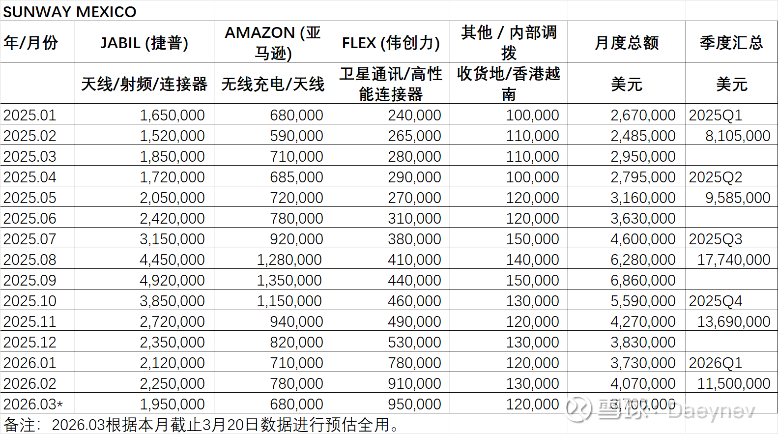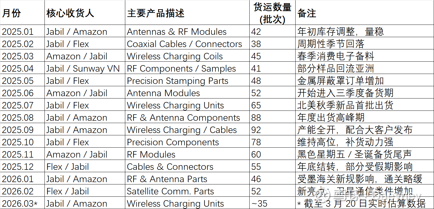 季报将商业卫星通信列为第二增长曲线核心,明确 “保持商业卫星领先优势,加大与北美两大客户的业务合作”;内部表格中,越南工厂 90% 以上收入来自SpaceX(星链直供)+WNC(星链终端代工厂),墨西哥工厂 Flex(星链核心代工厂)的卫星通信业务金额从 2025 年 1 月 24 万美金增至 2026 年 3 月预估 95 万美金,逐月高增,完全印证季报的卫星业务落地进度。同时,季报提及 “全球消费电子复苏,AI 终端带动天线、无线充电等核心产品增长”;内部表格中墨西哥工厂的核心客户 Jabil(苹果代工厂)、Amazon(亚马逊)在 2025Q3(消费电子旺季)出货额 / 批次大幅放量,与季报的消费电子业务复苏节奏完全匹配。
